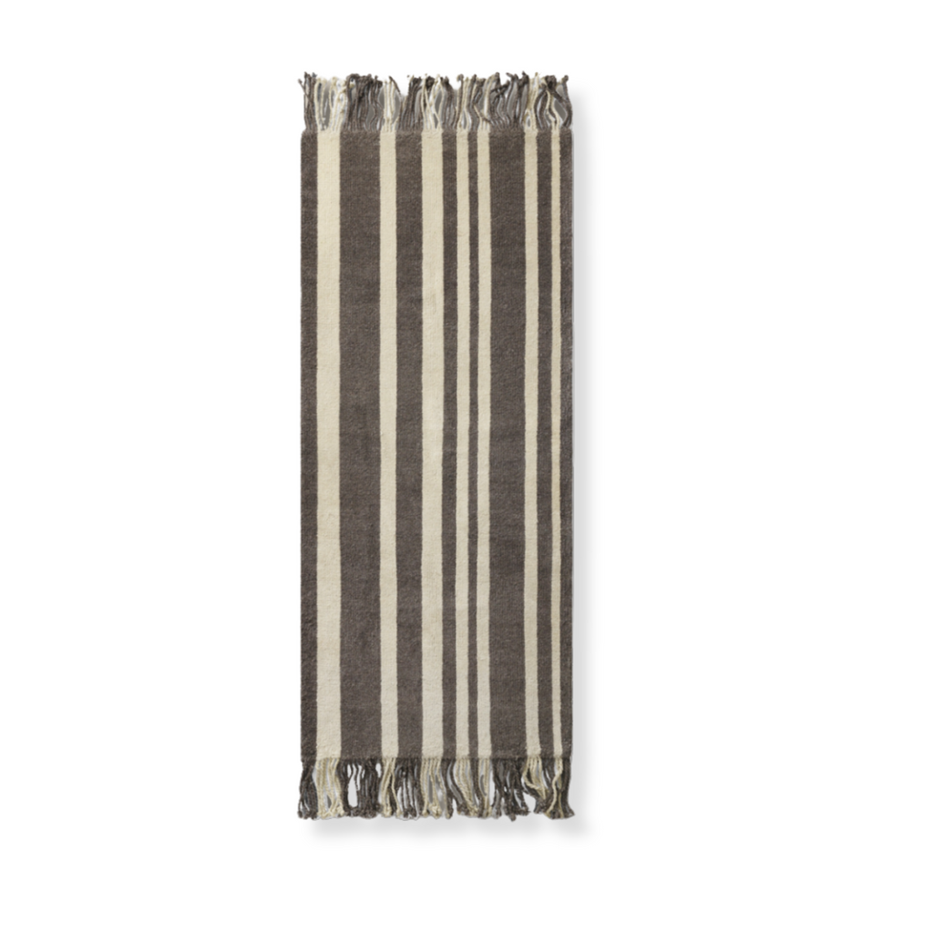 Colonnade no.05 is a hand-knotted low pile rug. The soft contrast between the dark brown/grey and sandy beige creates an eclectic and bold signature piece for hallways and narrow spaces. Adding long fringes elevates both end lines and adds an artistic detail.