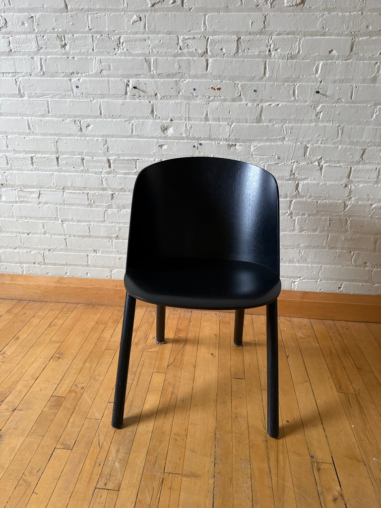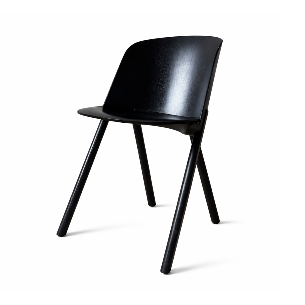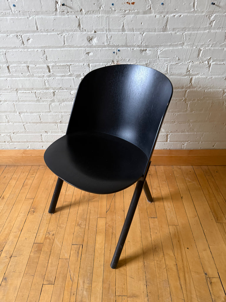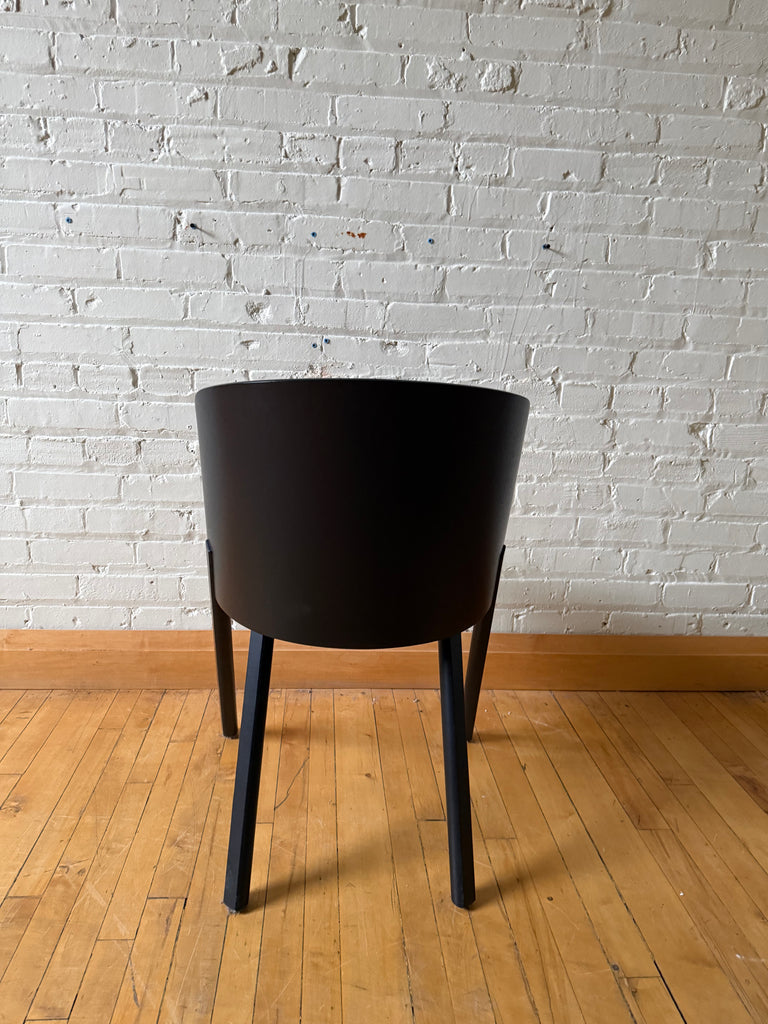 Elevate your space with these vintage modern black chairs, featuring a sleek, sculptural silhouette and sturdy angled legs. Their minimalist design pairs effortlessly with contemporary, industrial, or mid-century interiors. These chairs are authentic vintage pieces, offering unique character and timeless appeal. Please note: condition is as is, with natural signs of age and use that enhance their charm.
