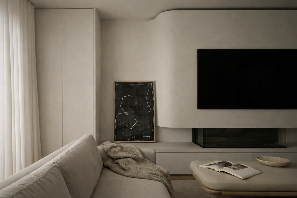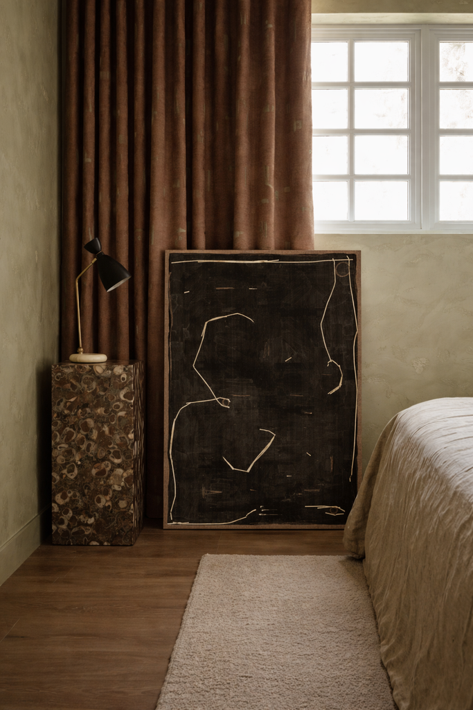 Mid-century inspired artwork featuring clean lines, warm earthy tones, and bold geometric forms for a timeless, modern feel. Framed in a light wood moulding with a simple profile.